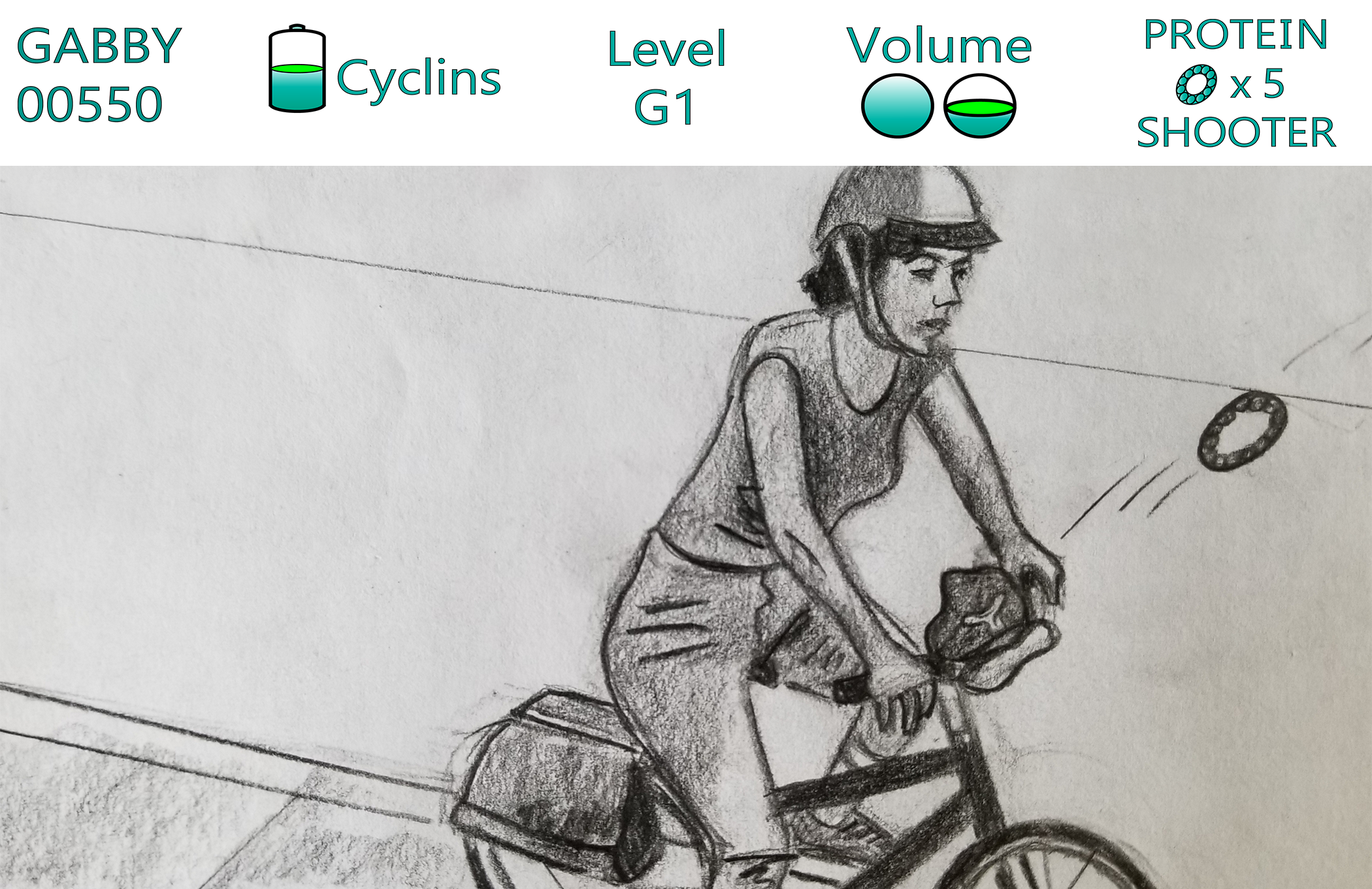 In the S- phase level, Gabby must bike down the sidewalk and correctly match DNA base pairs as she embodies DNA polymerase. The arrow keys help her toggle between base pairs.